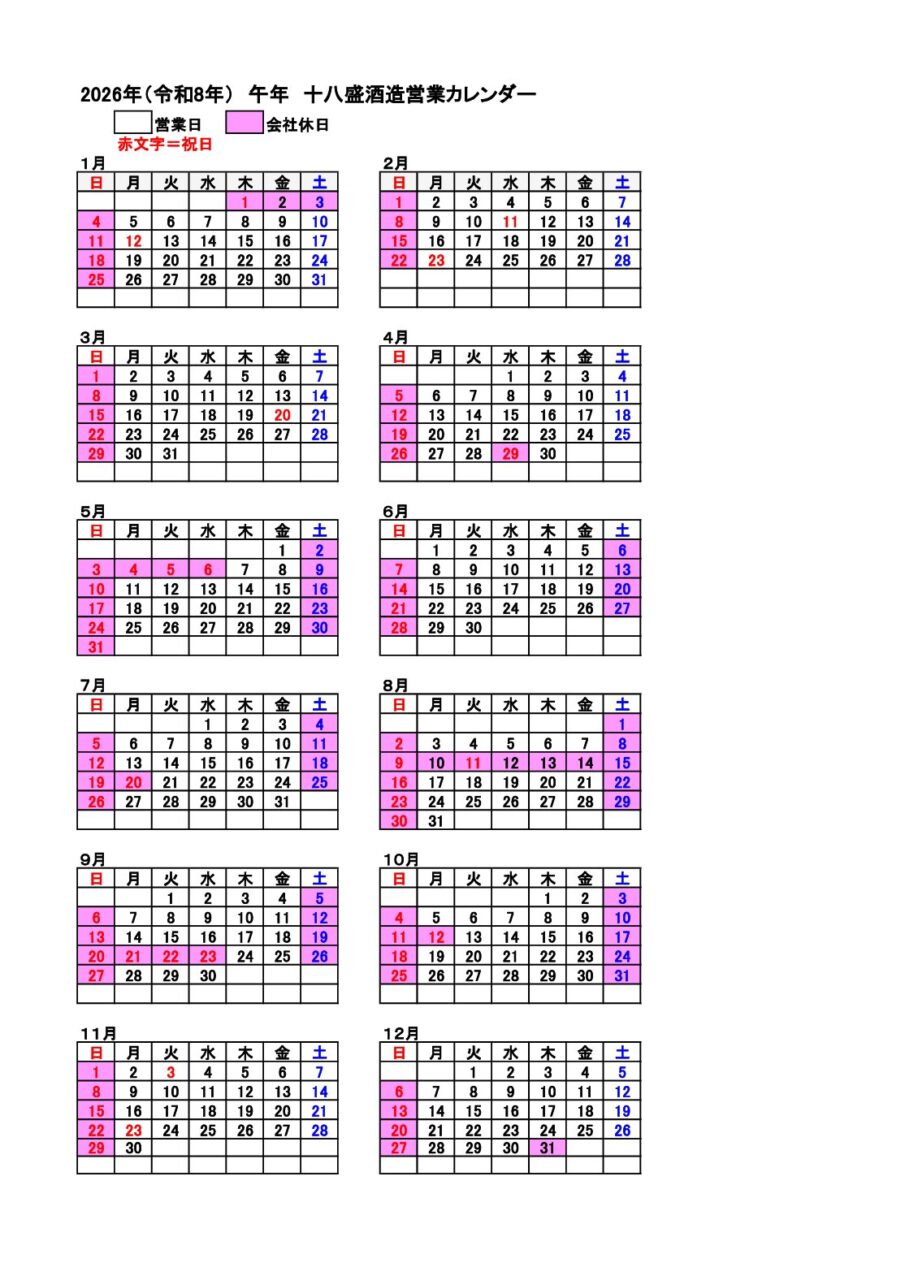 十八盛営業日カレンダー2026